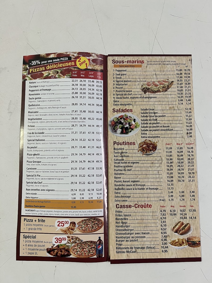 Welcome to Pizzeria St-Pie, a culinary gem nestled in the heart of Saint-Pie, QC. Known for its inviting ambiance and stellar service, this pizzeria offers a mouthwatering menu that captures the essence of comfort food. Their standout dishes include perfectly crafted pizzas, praised for their ideal crust and balanced tomato sauce. Customers rave about the golden cheese that melts beautifully with every bite.